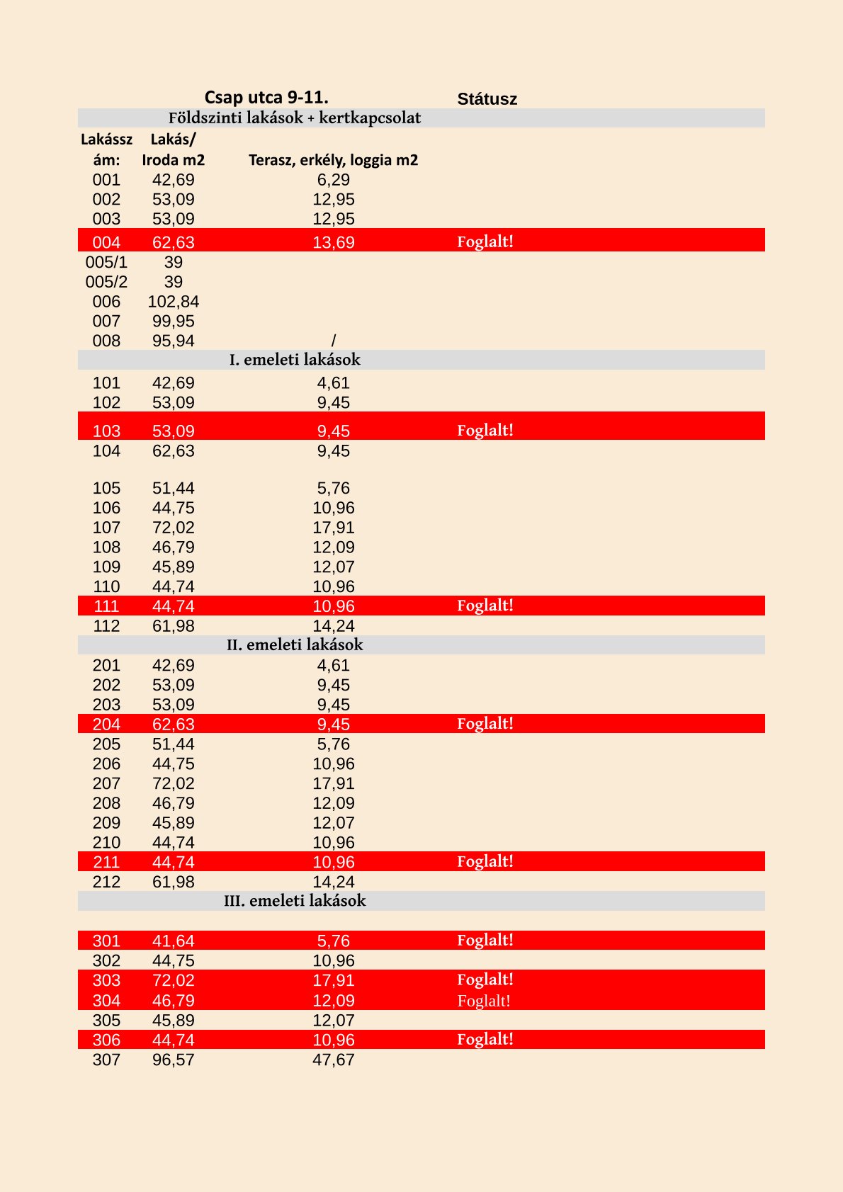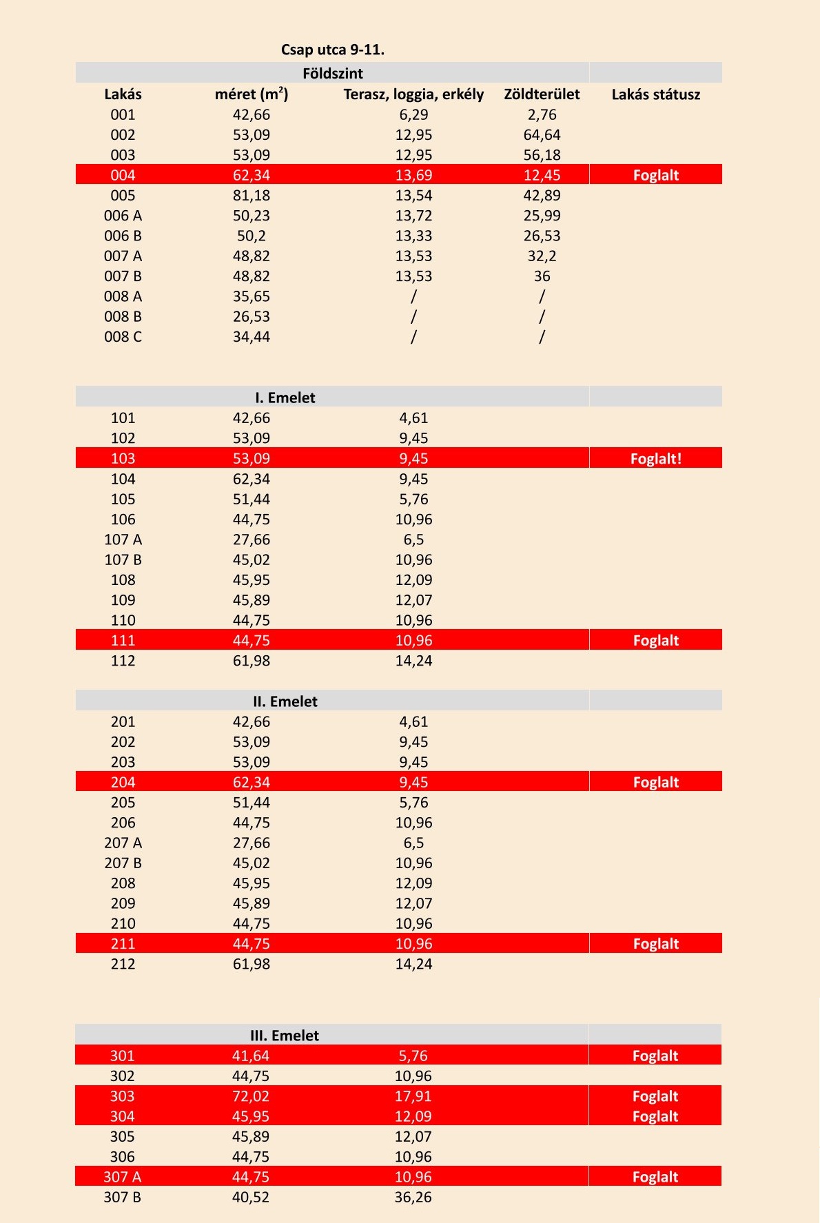 LAKÁS STÁTUSZ - Elérhető és foglalt lakások