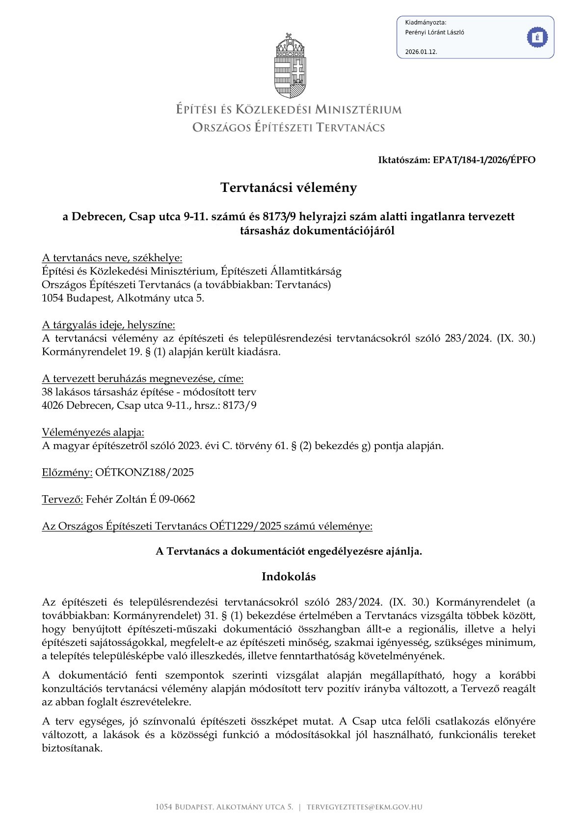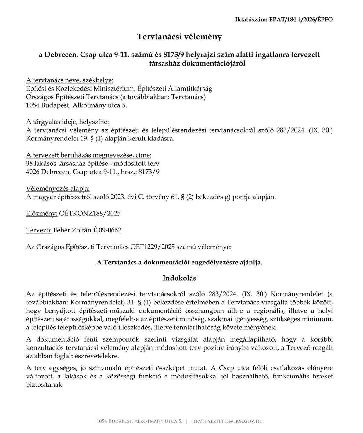 Országos Építészeti Tervtanácsi vélemény a dokumentációt engedélyezésre ajánlja.