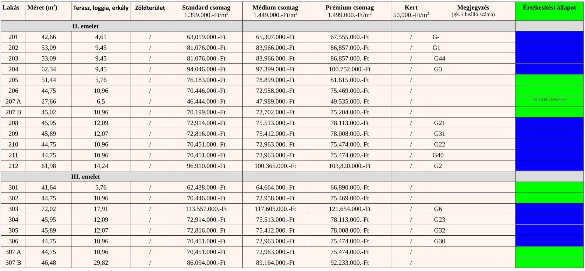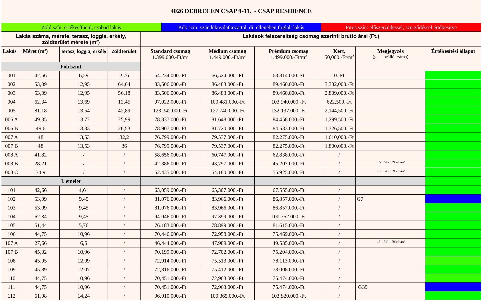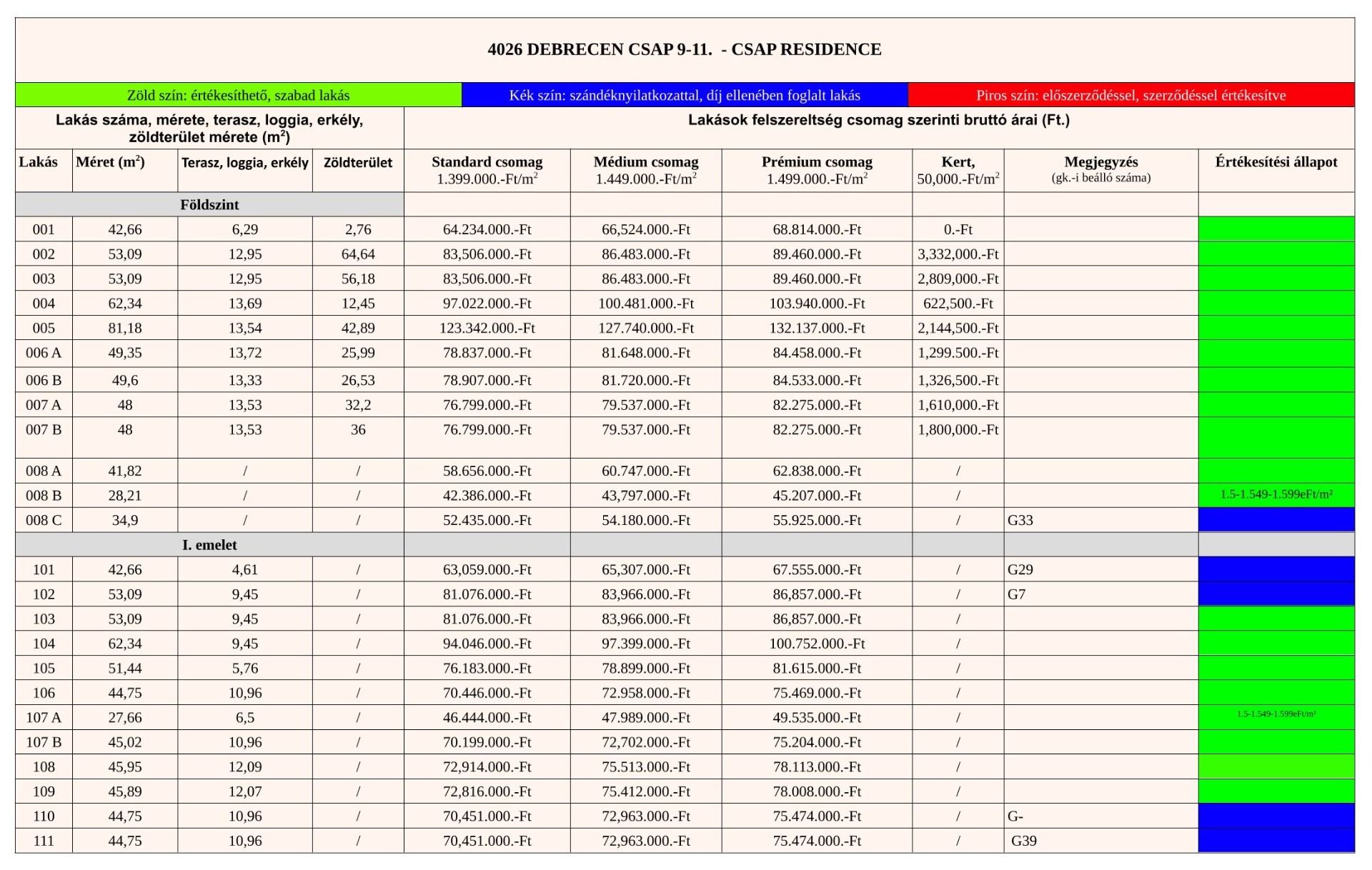Lakás méretek, felszereltségi csomagok, árak - értékesítési állapot!